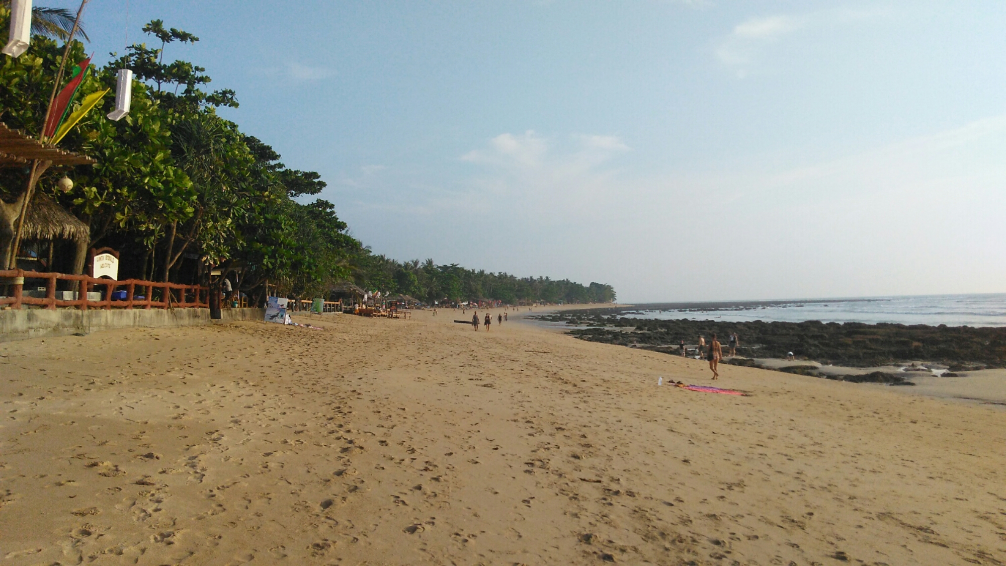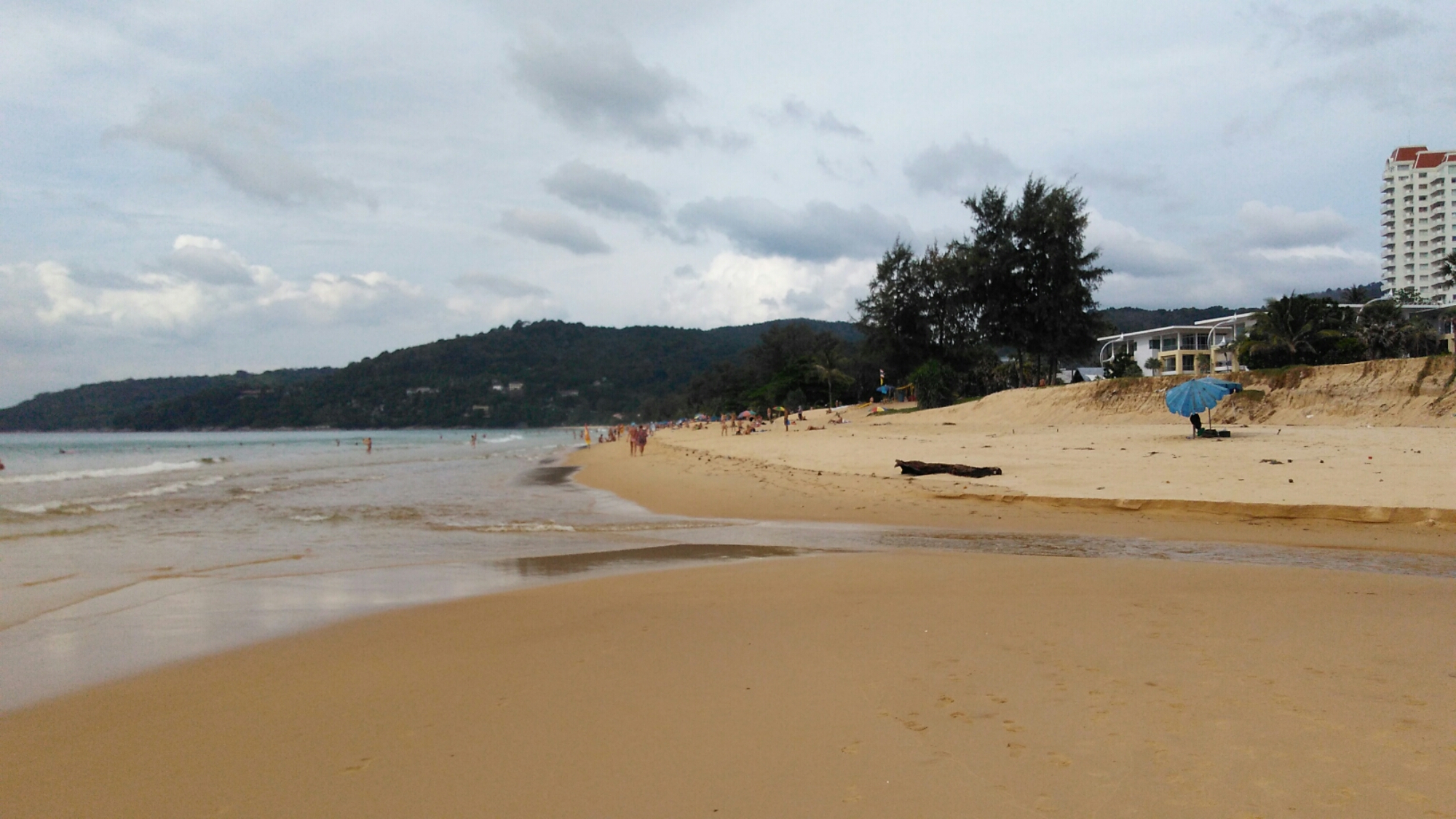Zum Teil gab es „Long Beach“ hohe Wellen bis ungefähr 1,5 Meter Höhe. In der Regel waren die Wellen kleiner. Während der letzten beiden Tagen war das Meer so ziemlich flach wie ein Brett. Das Wetter war überwiegend Sonnig mit Wolken. Am letzten Tag zog dann doch einmal ein Gewitter auf, welches für heftigen Regen sorgte. Das hielt eine Gruppe Thailändischer Touristen nicht davon ab, weiter Volleyball zu spielen. Das Spiel war eine einzige Katastrophe aber der Spass war offensichtlich riesengroß. Eine Dusche habe ich mir bei der Gelegenheit auch gegönnt. Selten gibt es so eine Abkühlung außer man besitzt eine Klimaanlage in seinem Zimmer oder geht in einen 7eleven Supermarkt.