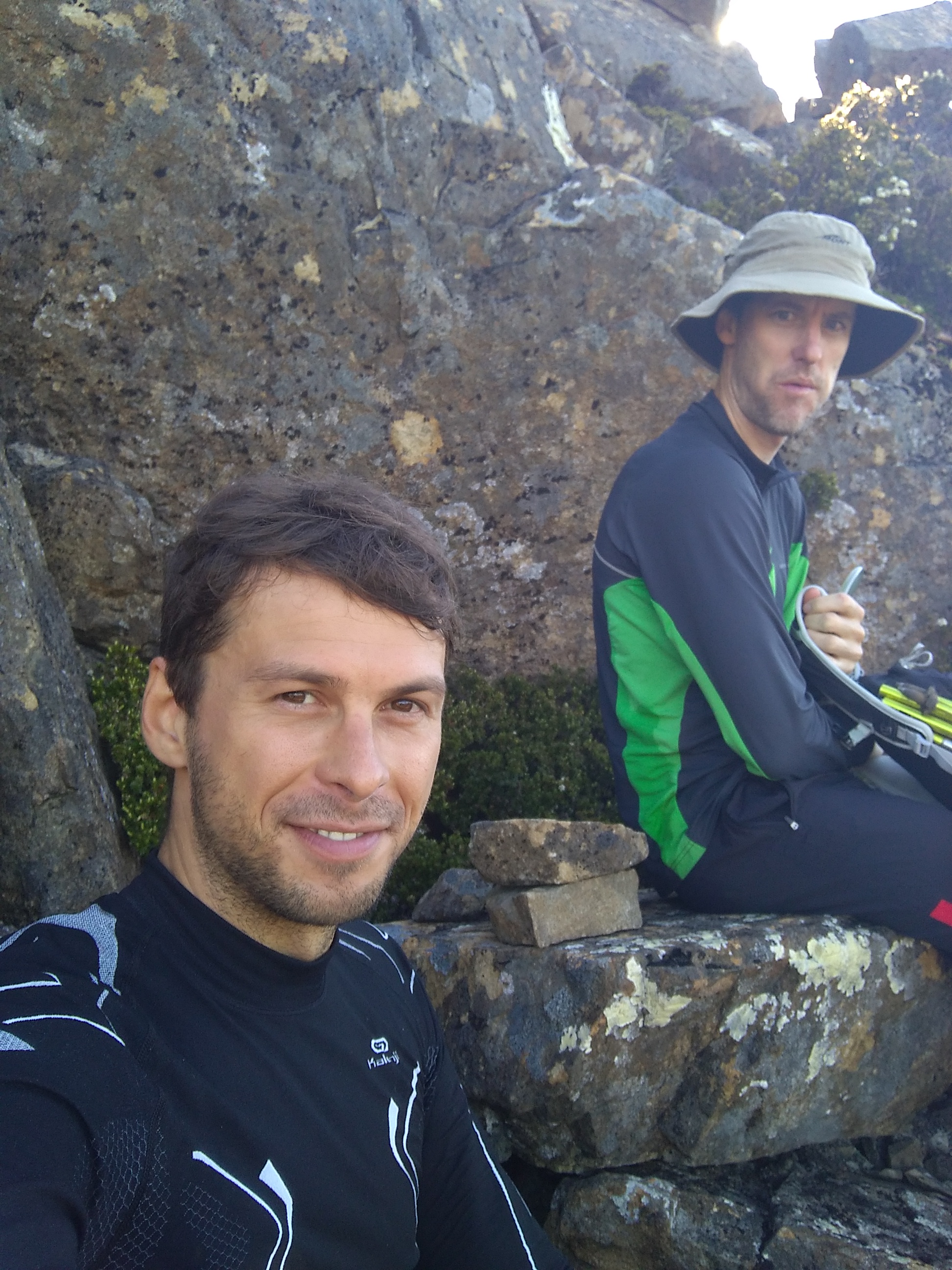 Los ging es um 4 Uhr. Schnell noch einen Eintrag in das Wanderlogbuch gemacht und schon sind wir losgelaufen. Naja, es waren eher Stufen mit einem mitlerem Abstand vom 1 Meter. So ging es die ersten 2 Stunden in die Morgendämmerung hinein. Hier erreichten wir die erste Hütte mit Wassertank und Plumpsklo. Wir machten nur eine kurze Pause. Jetzt ging es erst richtig los! Von hier aus kletterten wir einen Geröllabhang hinauf um unser erstes Ziel zu erreichen, Mount Eliza. Es macht irre Spass über grosse Felsen den Berg nach oben zu klettern. Hier brauch man auch Beine UND Arme. Fehler werden einem auch nur schwer verziehen hier.