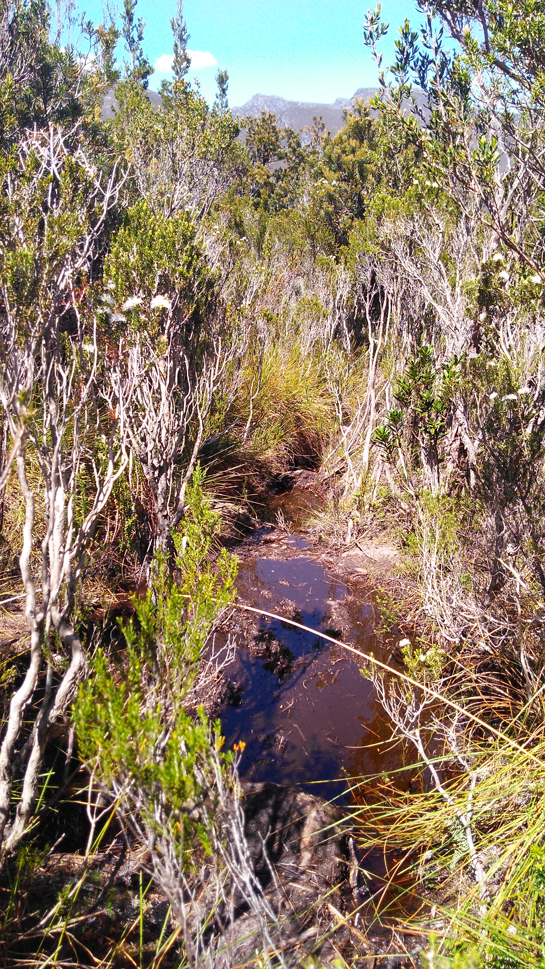 Wir erklammen noch einen weiteren flachen Berg, bevor es anschließend wieder Richtung Ausgangspunkt der Wanderung ging. Hier führte uns der Weg an einem Bach (Creek) hinunter. Es war angenehm kühl-nass. Endlich unten angekommen folgten wir weitere 2,5 Stunden einem Matschloch nach dem anderen. Knöcheltief einsinken war normal. Einmal steckte eines meiner Beine fast bis zum Anschlag in so einem tiefen nicht ersichtlichem Schlammloch. Schwupps und weg war mein Bein. Zwischendurch kühlten wir uns an einem schmalen Fluss ab. Es wurde doch relativ heiss mitlerweile.