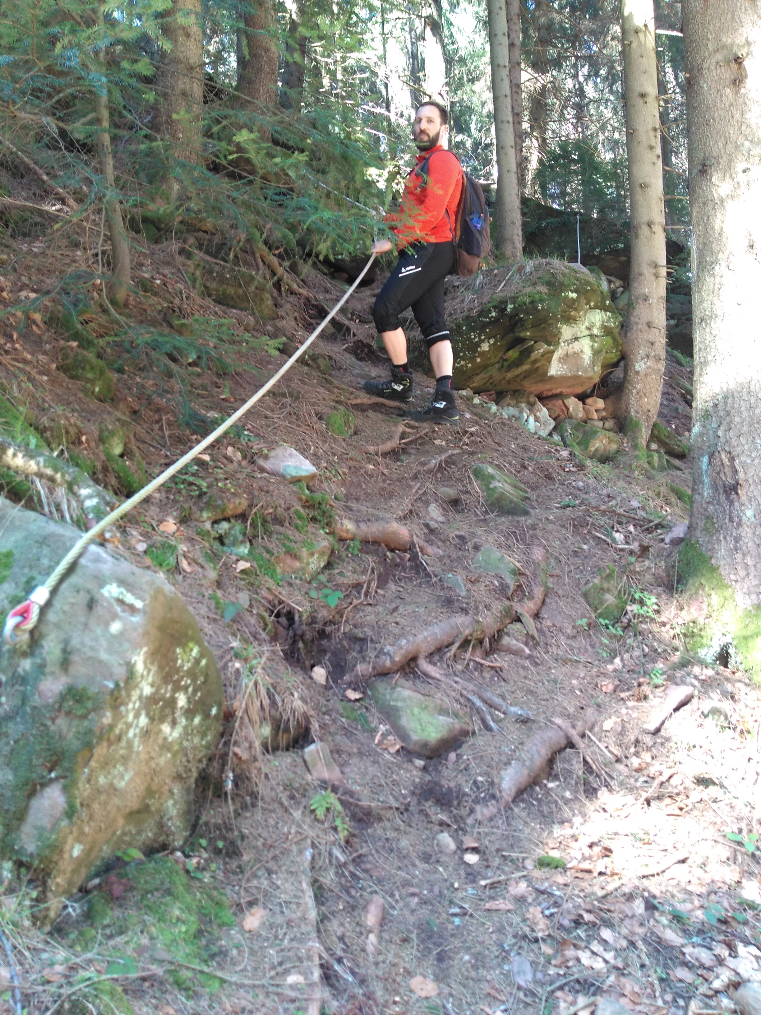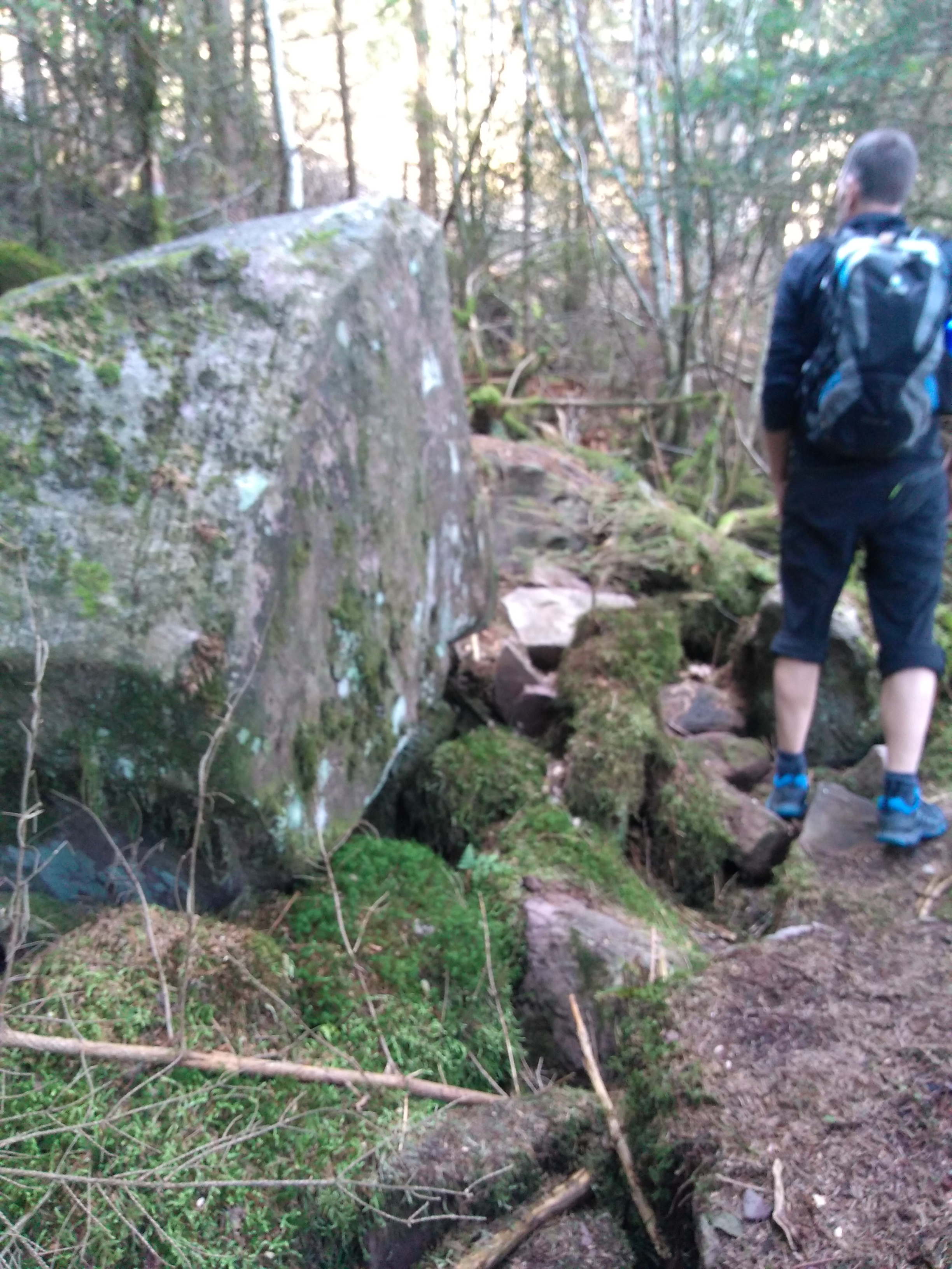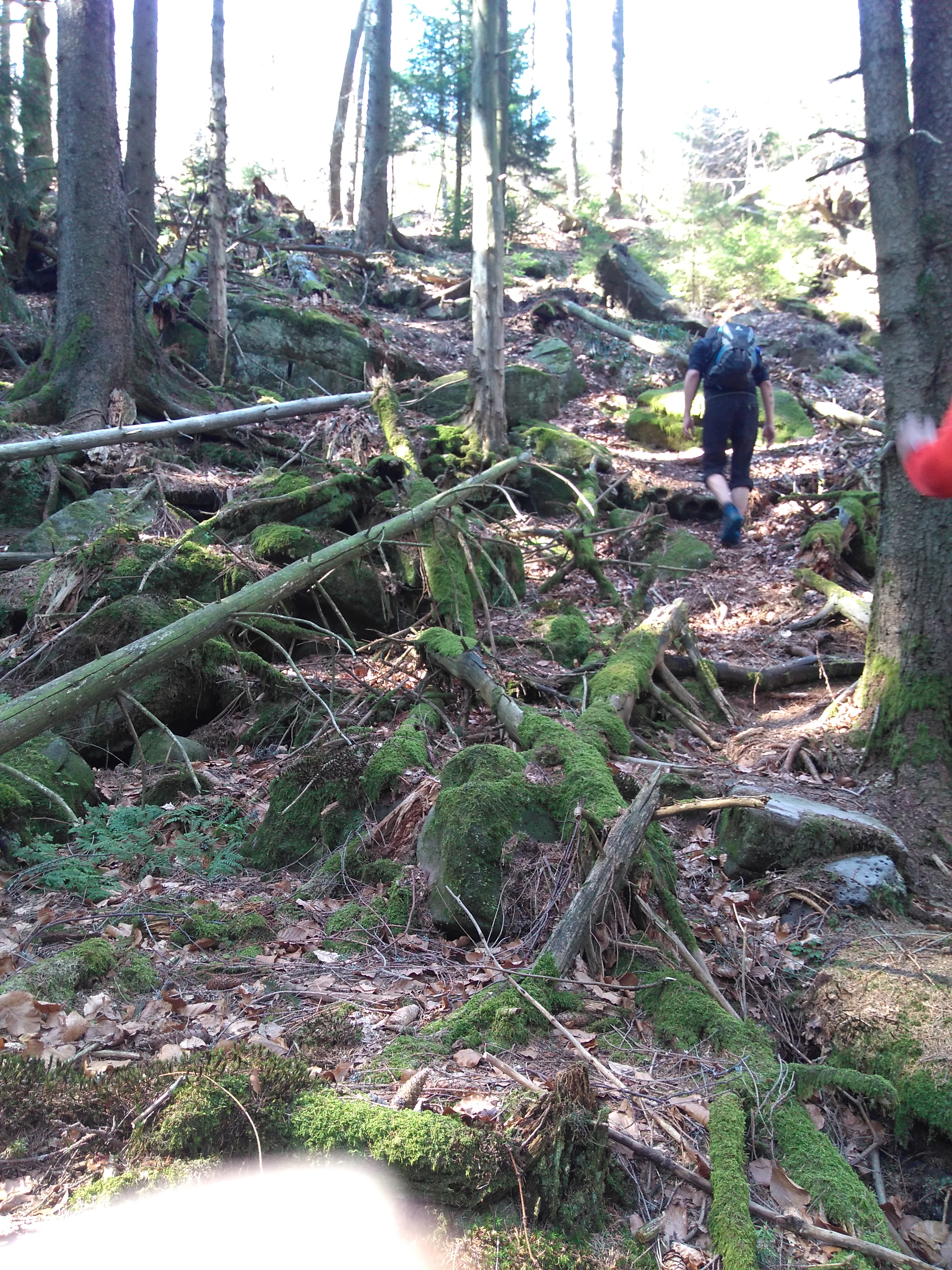 Wir wussten jedoch nicht, wie das Zeichen dieser Wanderung aussieht. Da wir uns mal wieser supergut unterhielten, sind wir früh schon falsch gelaufen. Wir merkten es nicht. Somit mussten wir auf unserer digitalen Karte suchen, wo wir eigentlich genau waren. Nach einem kleinem Umweg waren wir dann endlich auf dem richtigen Weg und fanden auch das entsprechende Zeichen an der Stelle, wo es ab ins Gelände ging steil bergauf, über Stock und Stein.