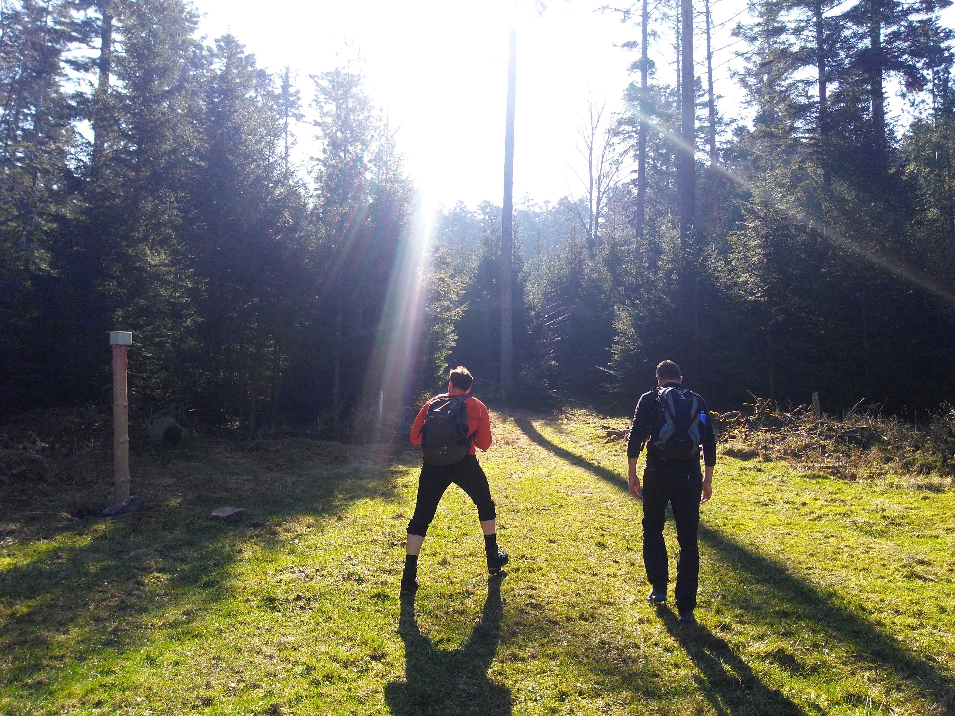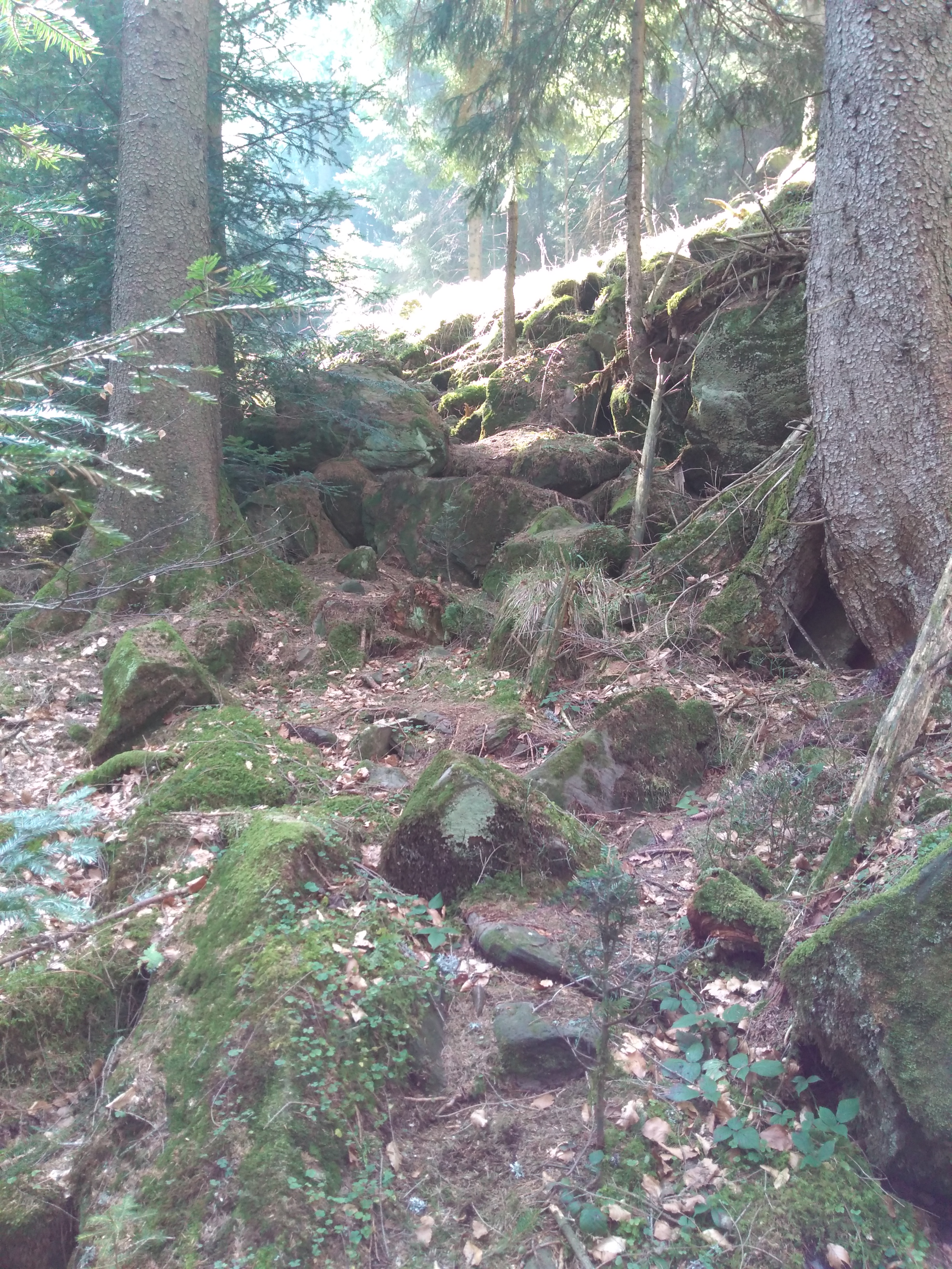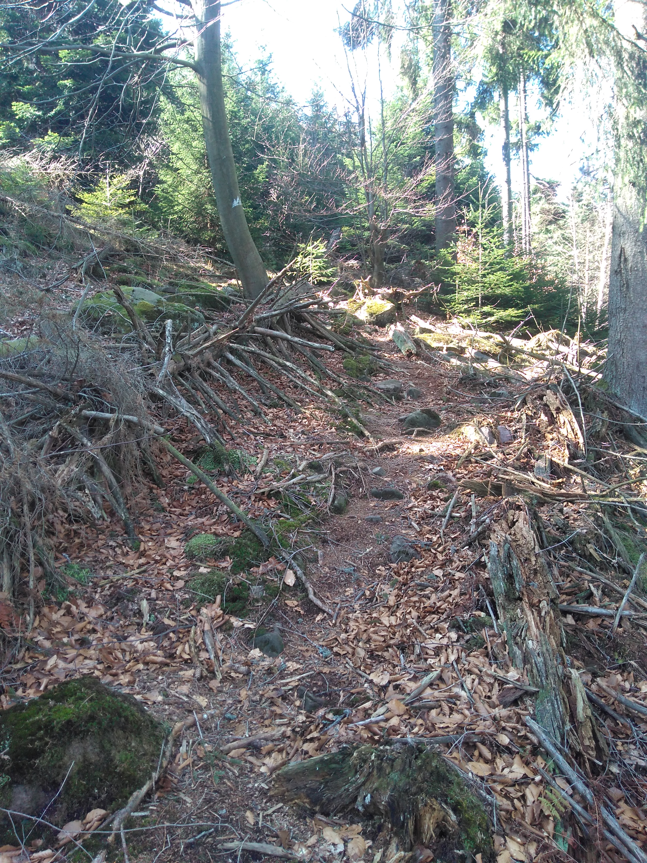 Wir wussten jedoch nicht, wie das Zeichen dieser Wanderung aussieht. Da wir uns mal wieser supergut unterhielten, sind wir früh schon falsch gelaufen. Wir merkten es nicht. Somit mussten wir auf unserer digitalen Karte suchen, wo wir eigentlich genau waren. Nach einem kleinem Umweg waren wir dann endlich auf dem richtigen Weg und fanden auch das entsprechende Zeichen an der Stelle, wo es ab ins Gelände ging steil bergauf, über Stock und Stein.